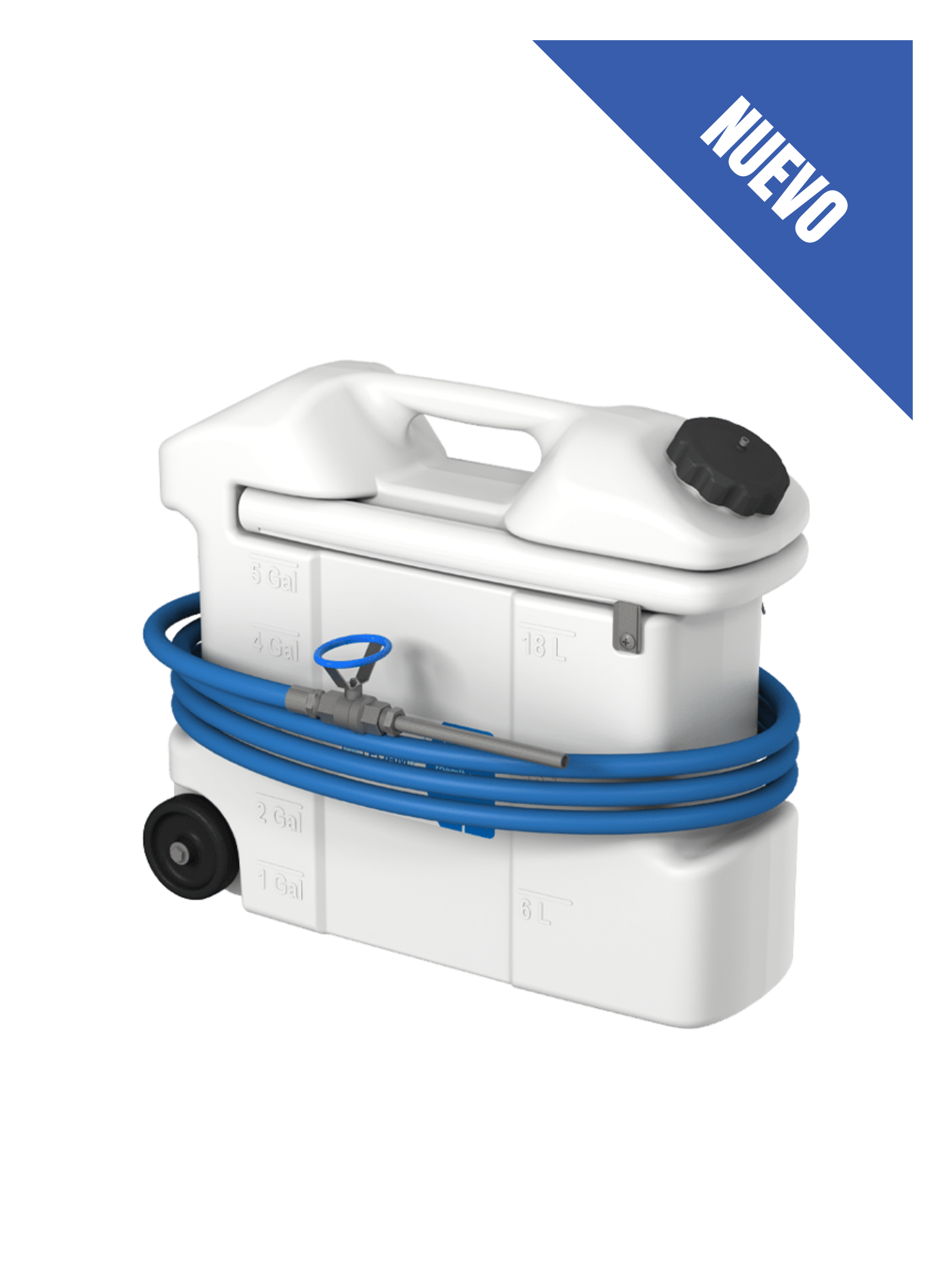 Unidad de espuma portátil de 5 galones, accionada por aire y con mezcla previa. Configurable con sellos de Viton, Kalrez o Santoprene, y opciones de color para la manguera y la tapa.