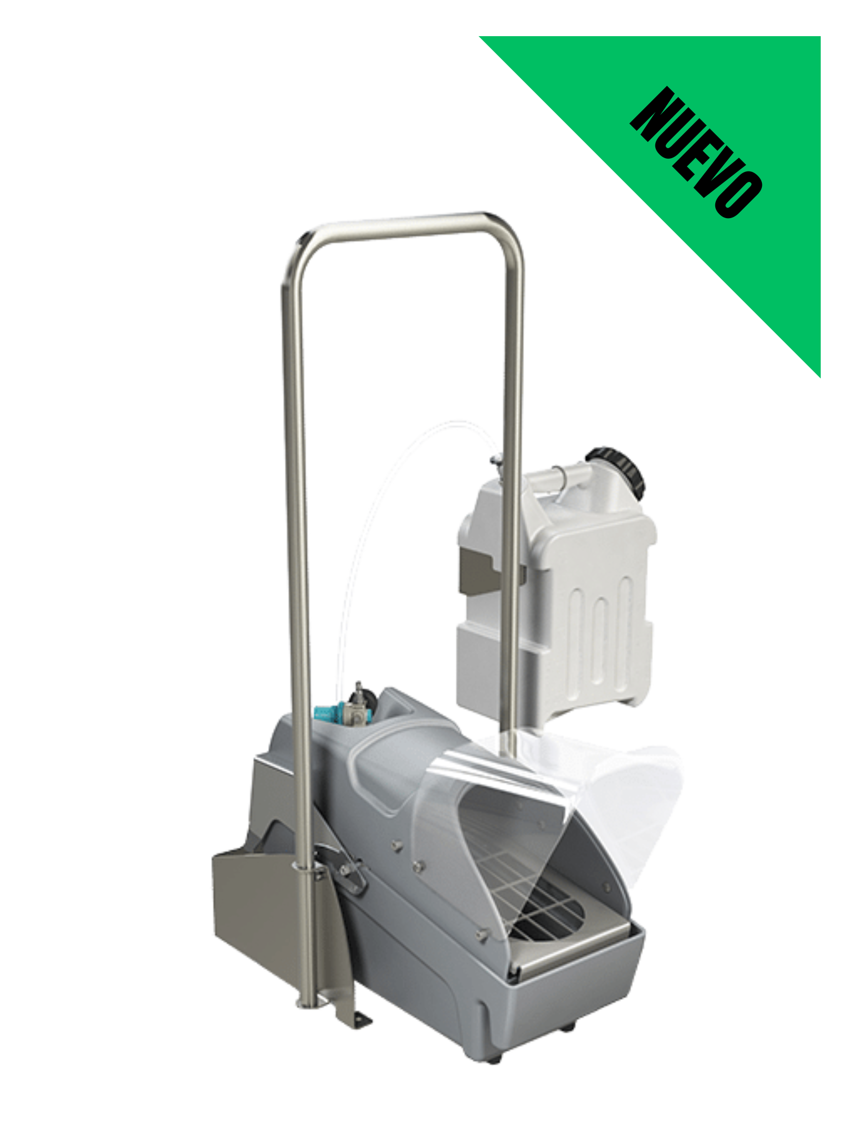 Unidad de sanitización de calzado con manija de soporte de acero inoxidable, accionada por aire comprimido. Incluye un depósito de 2.5 galones y toma de una solución premezclada.